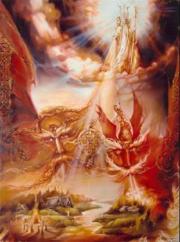 Семаргл - сын Сварога, а посему - Сварожич. Славянский Огнебог, один из Сварожьих первенцев, родившийся из Огня: искры от удара отцовского небесного молота по Алатырь-камню. Бог-хранитель Первородного Огня входил в семерку ключевых богов древнеславянского пантеона. Идолы этой семерки стояли в Киеве еще в 980 году н.э., при правлении князя Владимира. Но в древнерусских летописях о Семаргле написано мало и невнятно, имя - и то писалось всякий раз по-другому: то Симарьгл, то Семарьгл, то Раклий, а то и вовсе из одного имени получалось два - Сима и Регла. Судя по всему, летописцам было непонятно, что означает это имя и что за божество его носит, настолько не характерным для славянской мифологии был этот образ. Похоже, что истинное имя бога Огня доподлинно неизвестно; но не по причине непонятливости наших предков, а в силу особой святости обитавшего среди людей Бога. Его имя не то, что не поминали всуе, а вообще старались вслух не произносить, заменяя, в случае необходимости, иносказаниями. Как и все первенцы Сварога, Бог Семаргл участвовал в битве сил Света с силами Тьмы, которую мы знаем как Изначальную. Результатом той битвы стал окончательный передел Мироздания и четкое разделение трех миров: Прави, Яви и Нави. После установления границ миров Семаргл долго был главным защитником Прави, вплоть до рождения Бога Перуна. Ему и передал эту миссию, как достойному преемнику, ибо ни Перун, ни Семаргл не уступали друг другу в воинской доблести. Сам же Огнебог выполнял уникальные функции, две из которых были присущи только ему, и никому более. Первая - концентрация силы и способность усиливать и объединять мощь всех братьев-Сварожичей. Стоило Семарглу появиться на бранном поле, как сила Ясуней возрастала многократно, и они становились непобедимы. Существует огромное количество преданий, которые повествуют о его помощи многим богам в то и дело возникающих битвах с тёмными силами. Учитывая оставшиеся в фольклоре описания сражений с участием Семаргла, а так же то, что его кумир всегда устанавливался справа от идола Перуна, можно заключить, что Огнебог - покровитель воинов. Второй уникальной миссией Семаргла была передача воли Богов из мира Прави в Явный мир. Огненный вестник был связующим звеном между Богами и людьми, регулярно информируя тех и других о новостях и событиях, происходящих в разных мирах Вселенной. У древних славян появление людей было связано с огнём: сотворенные Богами из палочек мужчина и женщина ощутили разгоревшееся между ними любовное пламя, следствием которого стало возможным появление потомства и продолжение человеческого рода. Так что хранитель первозданного Огня, питающего жизнью и теплом весь мир, являлся хранителем и домашнего очага, и семян, и посевов, и плода любви супружеской пары. Почитали его так же в качестве Бога огненных жертвоприношений и Луны. Семаргл стоит на страже нашего мира от проникновения в него Зла. Ночами, когда эти силы особенно активны, его огненный меч служит им надежной преградой. Весь год несет он эту службу, и лишь в день осеннего равноденствия покидает он свой пост - ради любви к прекрасной Купальнице, у которой от него в день летнего солнцестояния рождаются дети - сын Купала и дочь Кострома. Людям Огнебог являлся в виде воина в языках священного Ирийского огня. Мог он облик свой и менять, представая о