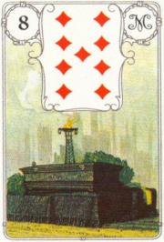 Значение карты и ее толкование также находятся в зависимости, от рядом расположенных карт. Внимательно изучив соседние карты, можно узнать, откуда придет опасность и каков ее характер. В сочетании с картами «башни», «косы», «развилки», предупреждает о возможном происшествии и несчастном случае. Если рядом «луна», то это говорит о душевной травме, потере близкого человека или родственника, в сочетании с унынием и подавленностью, если «солнце», то это конец черной полосы неприятностей, которые давно не давали вам спокойно жить. Чем ближе карта расположена по отношению к персональной карте, тем серьезнее угрожают проблемы. Но даже в случае, если она находится достаточно далеко, необходимо опасаться, так как карта предупреждает о возможности наступления серьезнейших проблем в ближайшем будущем. Следовательно, необходимо принять соответствующие меры по их устранению и предупреждению.