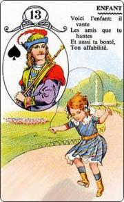 Описание карты: на ней изображен ребенок – мальчик, который катается на качелях и собирающийся поиграть. Его окружают волшебные существа, такие, как эльфы и гномы, которые тоже пытаются заигрывать. Чувствуется беззаботная атмосфера. Но в других колодах карт изображают девочку. Тем не менее, карта несет в себе невинность, наивность. Она предвещает неожиданную новость, сюрприз, приятное известие, развлечения, игры, приезд гостей, прогулки. Это карта будущего, прогресса и роста, духовного обновления, символизирует прошлое и связанные с ним воспоминания.