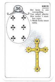 Описание карты: на ней изображен крест, который несет в себе страдание, мучительную боль. Она последняя в колоде, отвечает за будущее. Показывает, как нужно продолжать жить дальше после неудач и ошибок, проверяет нас и испытывает на жизненную ориентацию. Эта карта судьбы. Также это вера, надежда, а также доверие. Если рядом легла карта «Крысы», это обозначает, что человек полностью потерял свою веру. Вы всегда должны верить в хорошее, только тогда, вас беды будут обходить стороной. Хоть «Крест» несет в себе грусть, разочарования, Вы все равно не должны просто так сдаваться, как говориться, без боя.