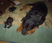 Я себе не прощу никогда, что умилялась периодически висящей на ротвейлерской пайке мелкой котейке. Это было так смешно: она в мясо вгрызалась, и если кусок вверх поднять - висела на нем, рычала, и как вертолёт, махала всеми лапами одновременн . Ротька у меня старая и добрейшая, за свою жизнь и учебным пособием для соседских детей была («А где у собачки глазик/носик/зубик?..»), и котят море перетерпела, и щенков. И с этой и спали, и играли вместе...