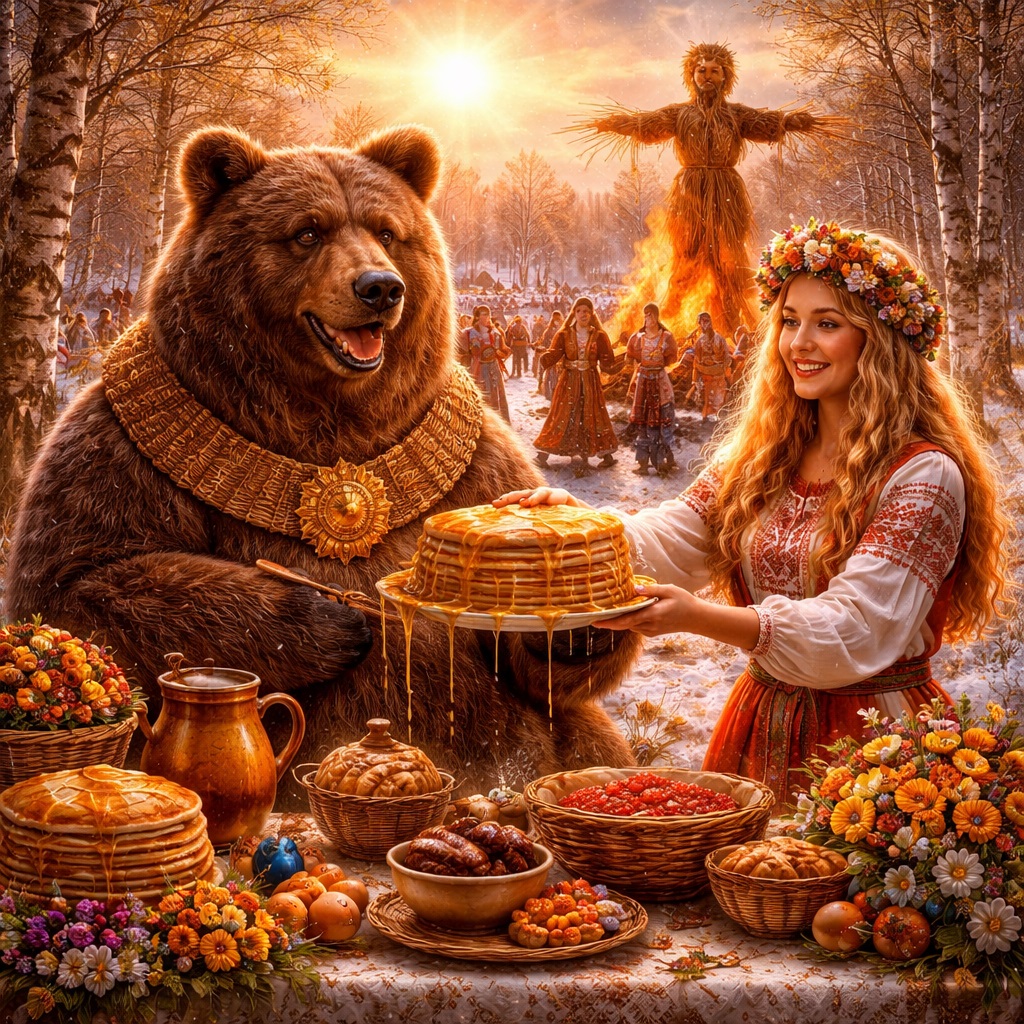 Одна из самых глупых ошибок — воспринимать медведя в Комоедице как милый сельский символ. Нет. Медведь здесь — это образ огромной, тяжёлой, зимней силы, которая просыпается не быстро и не ласково. В этнографических описаниях Комоедицы праздник прямо связывается с пробуждением медведя от спячки, а ритуальная еда и поведение людей имитируют медвежий мир.
