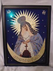 …Несколько лет назад, еще в мирном прошлом, нашли мы с одной из дорогих моему сердцу подруг способы порадовать друг друга взаимными подарками. Мой ход не важен, а вот в ответ мне была вышита самая любимая из моих христианских икон. (Да, я шла к Родной Вере от полного атеизма через христианство, и на тот момент была прихожанкой одного из московских храмов.)