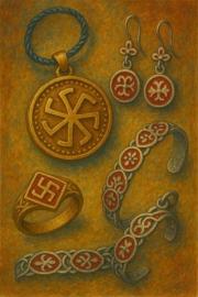 На поверхности могут быть гравировки, растительные орнаменты, дополнения с камнями (например, бирюзой, гранатом, фианитом). Одни мастера предпочитают минимализм (лишь свастичный знак), другие добавляют рунические вставки, изображения колосьев или цветов.