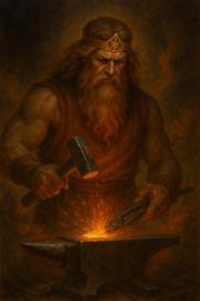 Он владеет огнём, молотом и небесной наковальней. Это бог, который не просто созидает, а творит через труд, удары, сопротивление материи.