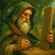 Кельтский миф гудит: бог‑королева Ога создал письмо, чтобы записать имя возлюбленной там, где его никто не сотрёт — на ребристом камне. Мудрецы услышали: «Если боги пишут линиями, значит линии — их язык». Так огам стал не просто алфавитом, а любовным заклинанием, врезанным в кость планеты. Романтикам — мурашки, скептикам — повод скрипеть зубами.