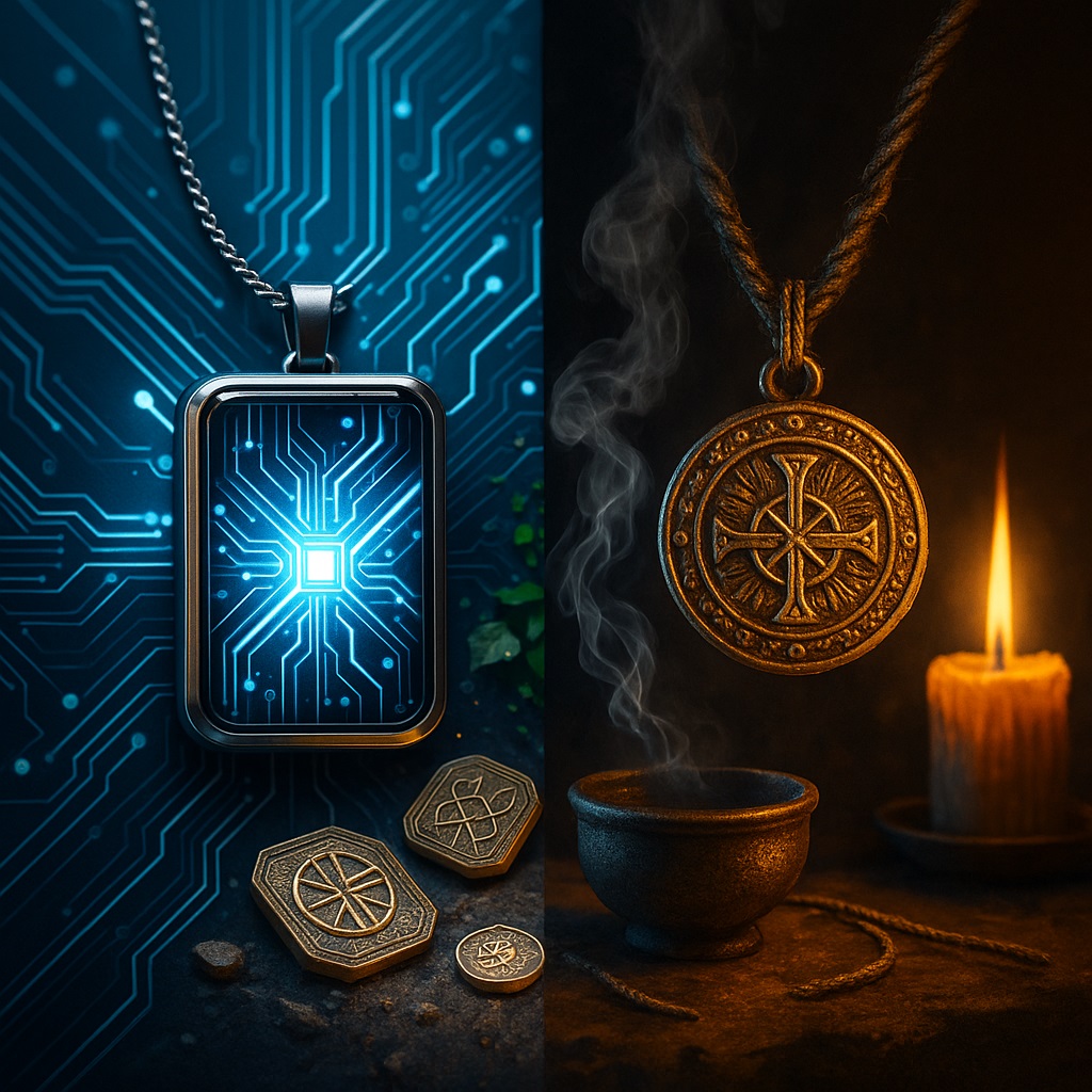 Когда-то амулет пах копчёной берестой, шуршал оберегом из кости и требовал шёпота под луной. Сегодня кулон подключается к смартфону, передаёт сердечный ритм в «облако» и мигает светодиодом, если поблизости сгущается стресс. Две вселенные — одна из пепла и веры, другая из кремния и квантовой математики — столкнулись на прилавке XXI века. Вопрос не в том, кто победит: вопрос в том, кто захватит наше воображение, кошелёк и душу.