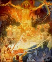 Праздник Даждьбога 7.04 23 числа месяца Элетъ славят и почитают первопредка славян Даждьбога Вешнего. В этот день он соединился брачными узами с Живой, отвергнув Марену; обручила же их Лада, Живина мать. День также знаменует начало Весны и Лета, поэтому именно сегодня впервые в наступившем году на пастбища выгоняют скот. В храмах и на вспаханных пашнях славят Даждьбога, разжигают в его честь костры и просят оберегать стада. А предыстория этого праздника кроется в легендах о деяниях Тарха-Спасителя, о тех временах мрачных, когда Тёмные Силы в очередной раз посягнули на жизнь, свободу и собственность жителей Прави и Яви. Где обманом, где речами лживыми да сладкими посулами, а где и силой, крали и пленяли земных жителей. Долгие годы к тому времени находились в Нави, к примеру, Коровы Небесные, угнанные Велесом с Ирийских пастбищ и отданные на хозяйство супруге его, Яге Виевне. Ещё Воды земные, родники светлые, в пещере глубокой были упрятаны, а на беЗкрайних просторах подземного царства, в разных ближних и дальних схронах-закоулочках, томились в плену украденные Горынычами люди разных возрастов и сословий. И царевны с царевичами, и ратники храбрые, и люди простые - кого там только не было! И принял решение Тарх-Даждьбог - пошел в царство Кощеево, всем полоненным на выручку. Как он их разыскал и освободил – отдельная история, а для данного праздника важно то, что в пылу той кампании освободил Тарх и самого Кощея Чернобоговича, которого по его же, Даждбоговой просьбе, заковала Богиня Марена в цепи тяжелые, и в самый дальний схрон Нави спрятала. Случайно то вышло - не признал в измождённом пленнике врага заклятого. ...Всем радостно было, что закончился для многих и многих плен страшный, у одного Даждбога на душе кошки скребли. Веселился Ирий Светлый, праздновал возвращение стада небесного, один Даждьбог печалился, что враг ненароком свободу получил. Мучали его мрачные предчувствия, и не зря. Втайне ото всех сговориись Марена с Кощеем новую пакость совершить: на веки вечные устранить Даждбога с пути своего. Пленить и спрятать так, чтобы впредь никто и никогда его больше не увидел и не знал, что с ним стало. И это было только первой частю плана коварного. Потому прямо на пиру подсела к нему Марена коварная, обворожила-околдовала его, свидание у себя в горнице назначила. Одна Жива, Богиня Жизни, почувствовала своим любящим сердцем, что недоброе против любимого затевается. Не пускала она Даждьбога к Марене, но не послушал ее Бог Светлый, обидел словами пренебрежительными. Мареной околдованный, страстью воспылавший, к ней пошел, у нее остася, а вскоре и свадьбу сыграли. Для того это нужно было Марене, чтобы живя с Даждьбогом в Ирии, незаметно для всех отбирать его силу могучую. Знали они, что если Даждьбога лишится Вселенная, то и равновесие мира нарушится, исчезнет из нее и свет белый, и Дух Божий, станет она подвластна Силам Тьмы и Зла. Когда засыпал слабеющий день ото дня Даждьбог, уходила она тайно к Кощею, планы строить - как им весь Ирий к рукам прибрать. Видели все Боги Светлые, что неладное с Даждьбогом творится, один он уже ничего не видел. Образумить его пытались, да не слушал он никого. Уж и Марену уговаривали не губить Даждьбога, но она лишь смеялась им в лицо. Рассердился тогда Сварог и изгнал Марену из Ирия, а ей только того и надо было: влюблённый и то