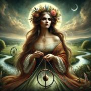 Пряха: Богиня часто изображалась с прялкой или нитями судьбы, подчеркивая её связь с жизненным циклом.