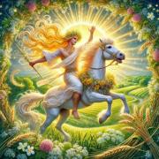 Едет на белом коне по полям, раздавая плодородие и жизнь земле.