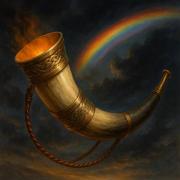 Представьте себе вселенскую паузу: звёзды будто выключили свет, реки забыли бежать, люди замерли в полуслове. И вдруг — гудок такой силы, что невидимые стены времени дребезжат, как стекло в старом окне. Это Гьяллархорн, рог стража радуги Хеймдалля. Его звук разрывает тишину на молекулы и кричит: «Асгард, проснись! Судьба уже в дверях!»