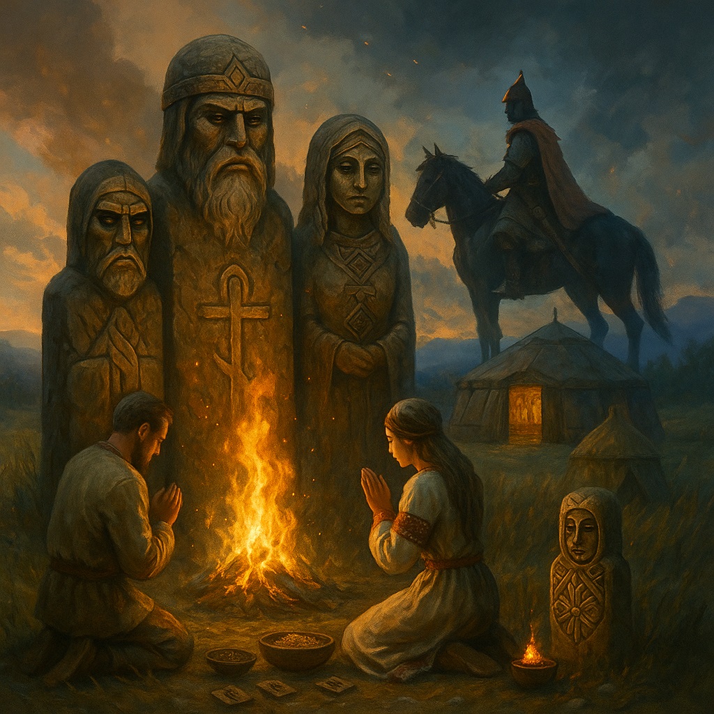 Монголо-татарское владычество не стерло язычества, а сделало его хамелеоном. Перун надел рясу, Макошь получила татарский узор, Тенгри подружился с Ярилой. Иго закончилось, но гибриды остались: крест на куполе соседствует с липовым веником у порога, православный колокол перекликается с шёпотом оладий на Ладино утро. Мы носим эти слои как генетический корсет, и если внимательно прислушаемся, то под шумом городской пробки всё ещё слышно: «Небо велико, но наше сердце шире».