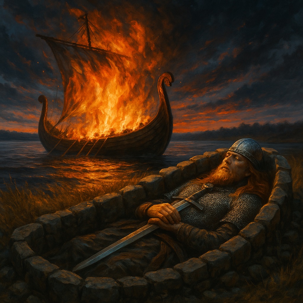 Героя клали на ладью, рядом — его оружие, амулеты, дары богам.