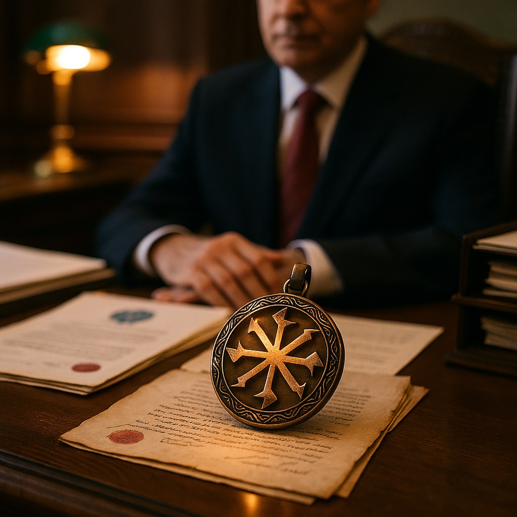 На шее у одной чиновницы — кулон в виде солнечного круга. У другого — кольцо с узором, подозрительно напоминающим рунический став. У третьего, тихого архивариуса, на лацкане пиджака — брошь в форме трискелиона.