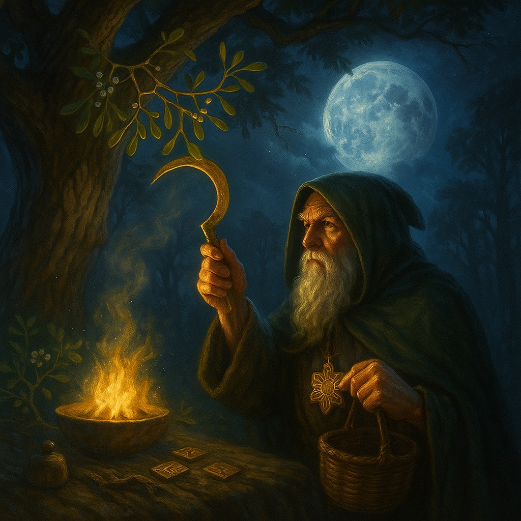 Жрец в белом плаще поднимается на дуб, режет серпом из золота (чтоб железо не «атаковало дух дерева»).