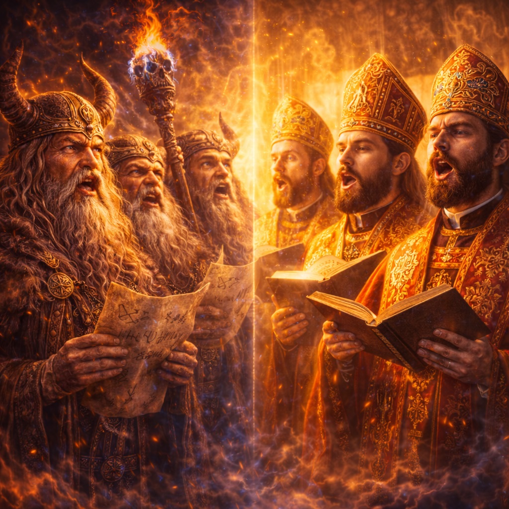 Сходство между богослужением и древним хором жрецов объясняется не тайным заимствованием, а универсальной природой человека. Голос, ритм и коллективность — древнейшие инструменты изменения состояния. Они работали тысячи лет назад и работают сегодня.