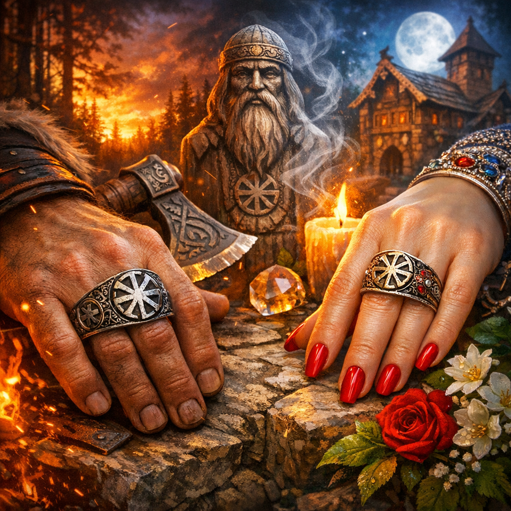 Есть сладкая ложь: будто женский оберег — это про покорность. На деле охрана дома начинается с охраны себя. Коловрат на кольце у женщины часто читается как: я не пущу хаос в свой круг. Не дам топтать границы. Не позволю разрушать отношения грязью, обманом, двойной жизнью.