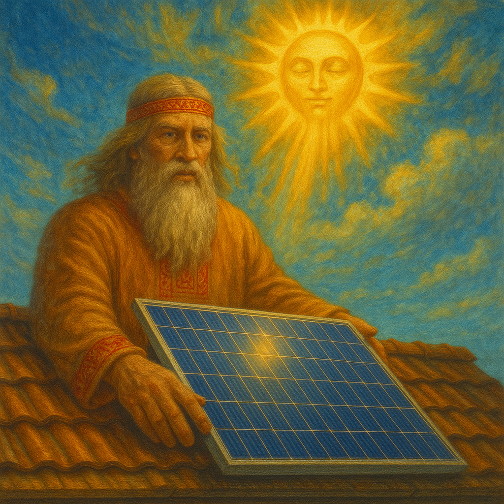 И если отбросить привычный скепсис, становится неуютно. Потому что картина слишком узнаваема: крыша как возвышение, солнце как источник силы, приёмник света как объект почти сакрального значения. И в центре всего этого — Даждьбог, древний солнечный покровитель, которого вроде бы давно «похоронили» в учебниках.