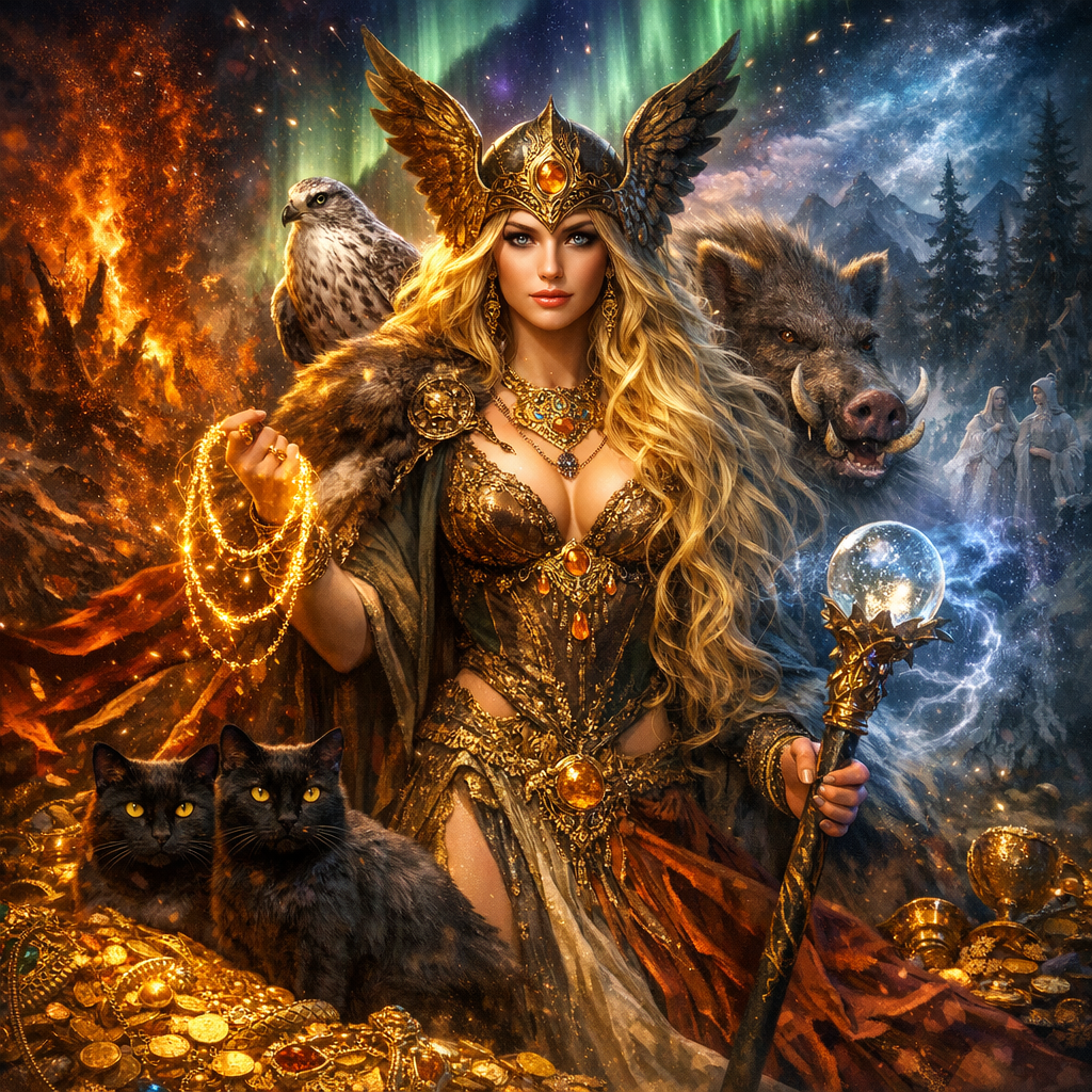 Фрейя стоит на границе. Она одновременно дарит плодородие и забирает павших. Она благословляет страсть и учит колдовству, которого стыдятся. Она любит золото и превращает слёзы в драгоценность. В любом обществе именно такие фигуры — самые неудобные, потому что они показывают: мир сложнее, чем «добро и зло».