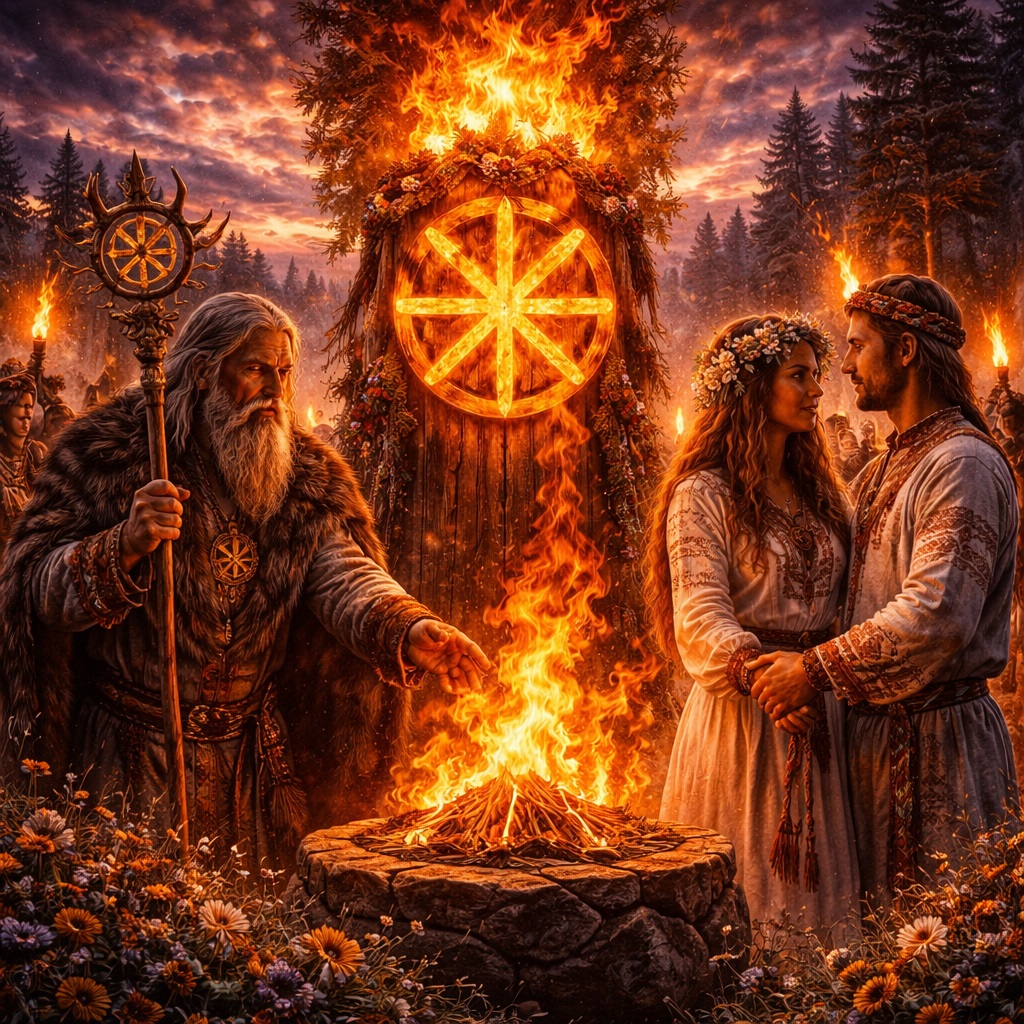 Именно это и есть живая формула Коловрата, только не в виде подвески на груди, а в виде обрядового действия. Колесо в огне — это не украшение праздника. Это зримая модель солнца, которое движется, горит, поворачивает год и переводит мир в новую фазу. Если где и искать древнее ритуальное пространство Коловрата, то прежде всего здесь — в солнечном колесе, пущенном в движение и пламя.