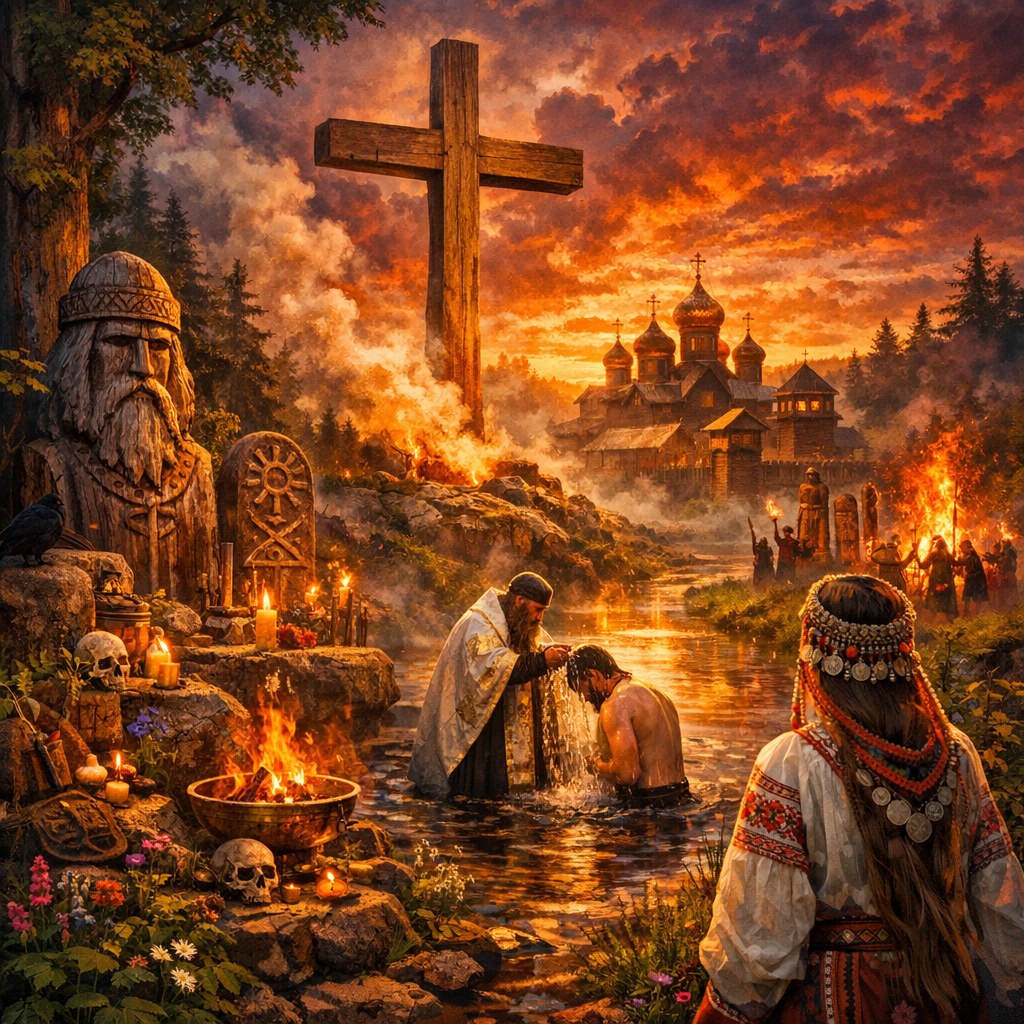 Русь пережила крещение не как стирание, а как переплавку. Старое не исчезло. Оно стало невидимым каркасом повседневности — тем, что мы делаем автоматически, не задумываясь, почему именно так.