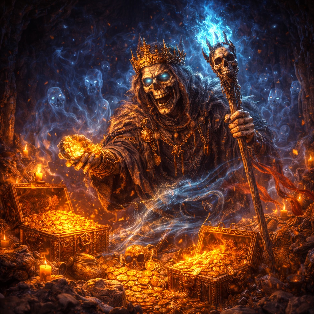 Потому что он сам — почти мёртвая форма хозяина. Не живой человек, не честный сторож, не родовой хранитель. Он существует только при сокровище. Не тратит его, не пользуется им, не живёт богато. В одном из популярных описаний кладового духа прямо подчёркивается парадокс: он охраняет несметные богатства, оставаясь при этом существом нищим и не пользующимся ими.
