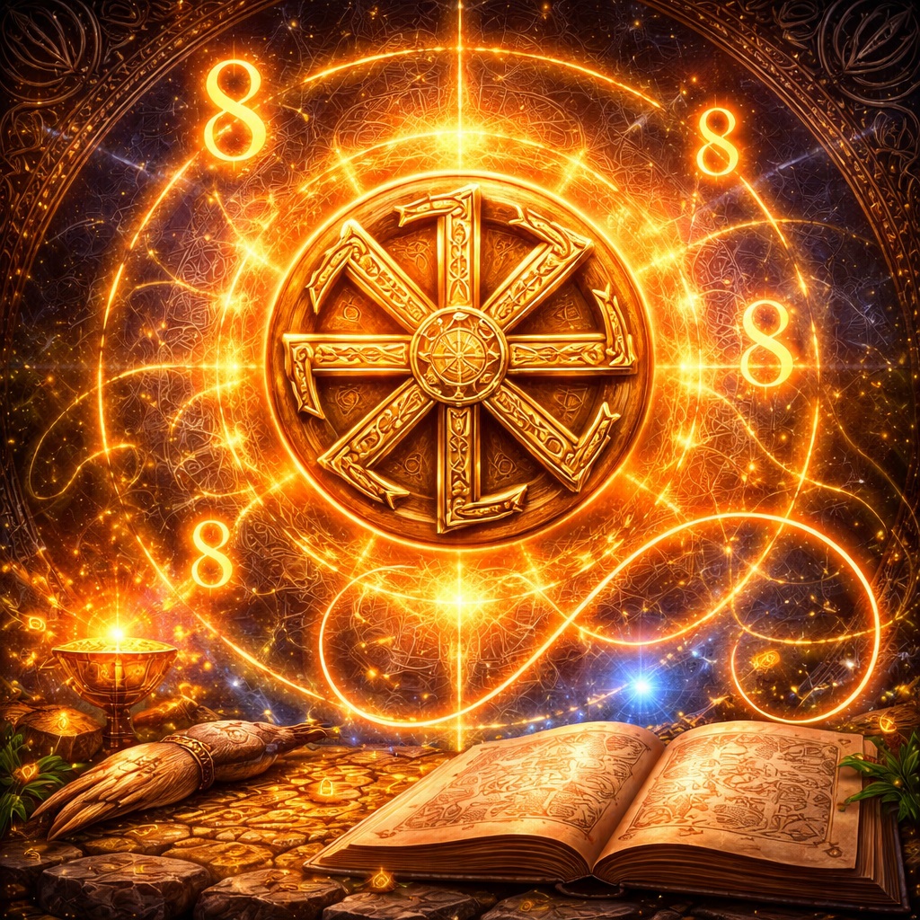 И вот здесь начинается настоящая тема. Потому что если Коловрат в нынешнем виде — не “археологическая инструкция из глубины веков”, а сильная символическая сборка, тогда вопрос о числе 8 становится не слабее, а серьёзнее. Почему именно восемь направлений так прочно приросли к этому знаку? Почему не четыре, не шесть, не двенадцать? Почему именно восьмёрка так убедительно держит идею солнцеворота, круга, движения и вечного возвращения? Ответ жёсткий: потому что восемь — это число, где круг перестаёт быть схемой и становится живым порядком.