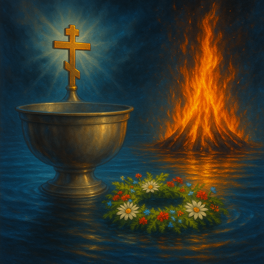 Крещение и Купала — это не враги. Это два разломанных зеркала одного и того же древнего переходного обряда. Одно зеркало смотрит в сторону системы. Другое — в сторону природы. Но человек стоит между ними. И в обоих отражениях он видит одно и то же движение: вход в воду, выход другим, прохождение через огонь, закрепление нового состояния.
