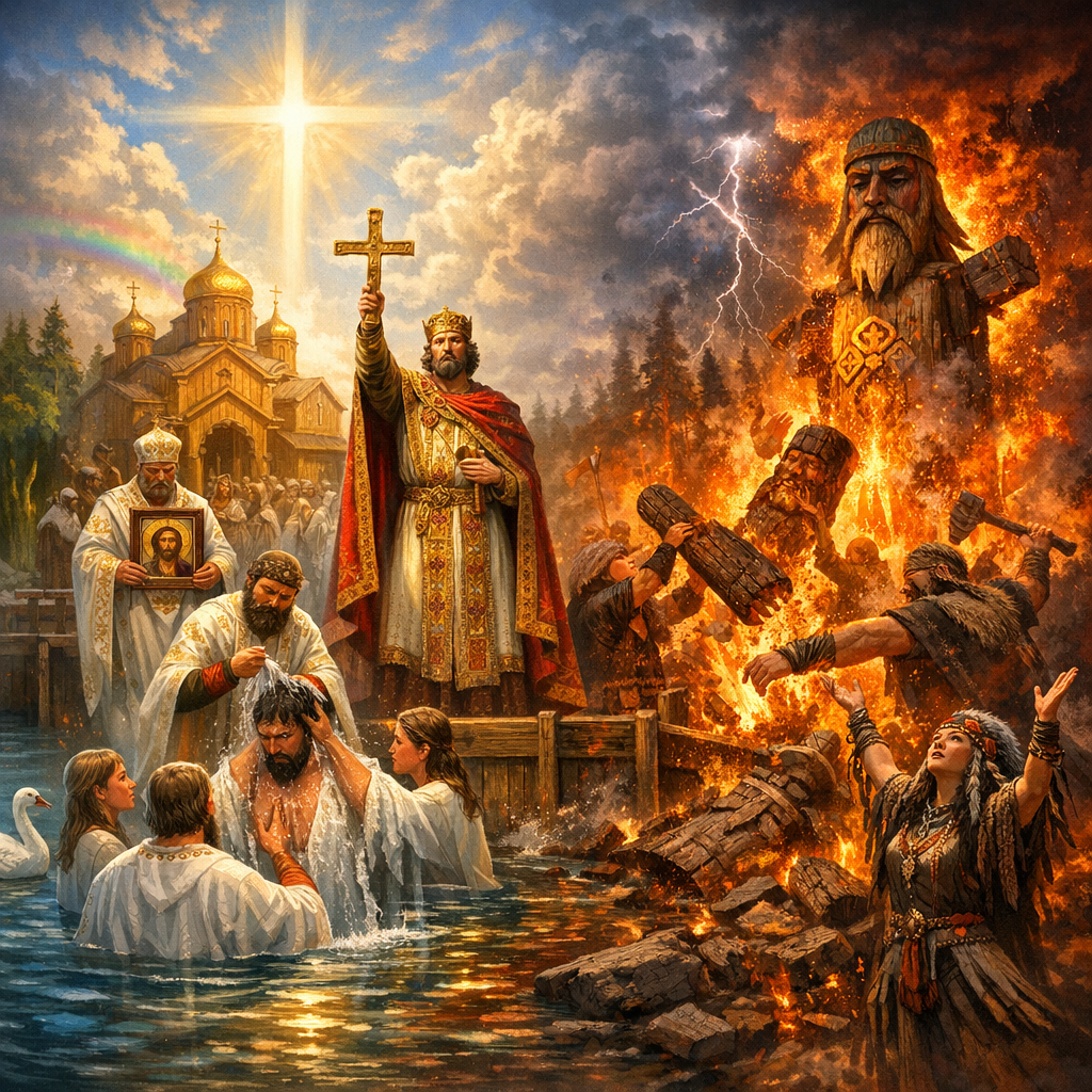 Крещение Руси было обращением к вере через разгром старого мира. Без уничтожения прежних сакральных опор новая система не закрепилась бы так быстро. Но без внутреннего принятия — хотя бы частью общества — она не пережила бы первое поколение.