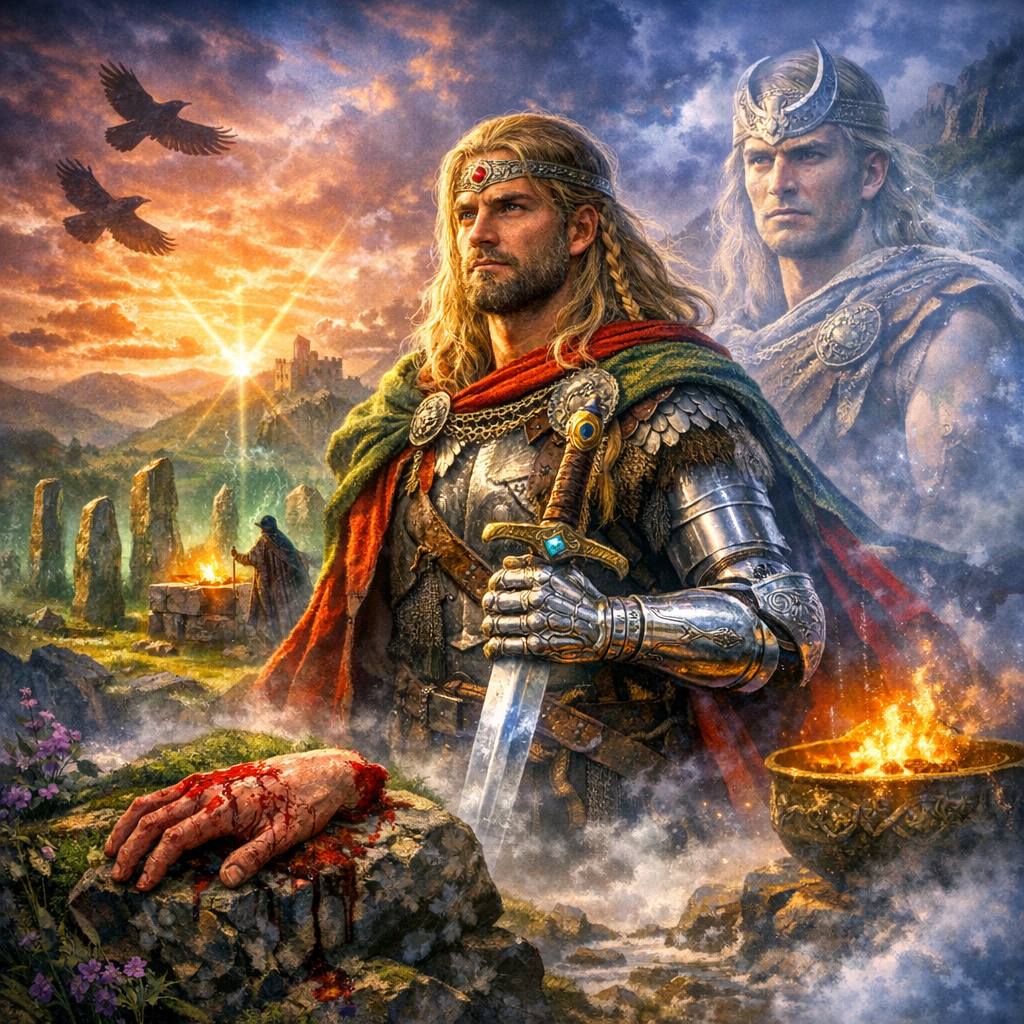 Вторая битва при Маг Туиред — кульминация. Луг, «многознающий», становится ключом к победе. В некоторых версиях Нуада гибнет от руки Балора. И это важно: легенда не делает из него бессмертного победителя. Она делает из него жертву эпохи, человека, который вернул себе власть, но не получил «счастливый финал».