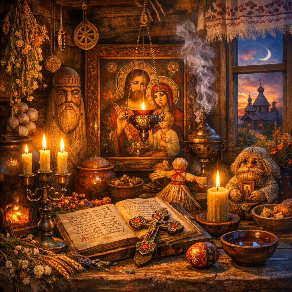 Вера жила в доме буквально. Дом не воспринимался как коробка из брёвен. Это был мир внутри мира, граница между «своим» и «чужим», «чистым» и «опасным». Поэтому в быту так много обрядов вокруг порога, печи, стола, очага, воды, огня, сна, рождения и смерти.
