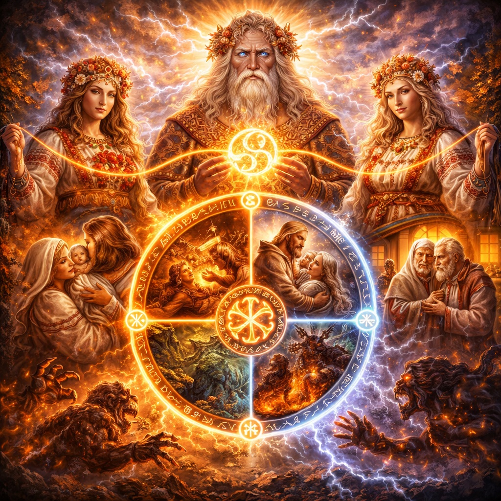 Так славянское сознание объясняло вещи, которые сегодня многие пытаются описывать языком абстрактной “плохой кармы”. Только у славян это не было отвлечённым мистическим счётом. Это было глубоко связано с долей рода, с положением человека в линии предков, с тем, что даётся и что человек потом может либо удержать, либо исказить, либо окончательно загубить.