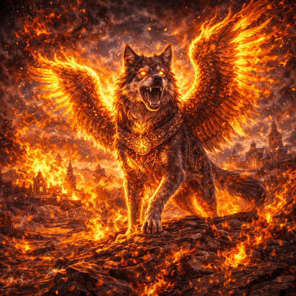 Это очень древний тип огня. Не показного, а глубинного. И именно поэтому образ крылатого пса здесь оказывается поразительно уместным. Пёс сторожит. Крылья переносят. Внутренний огонь сохраняет жизнь. Всё вместе складывается в фигуру хранителя перехода.