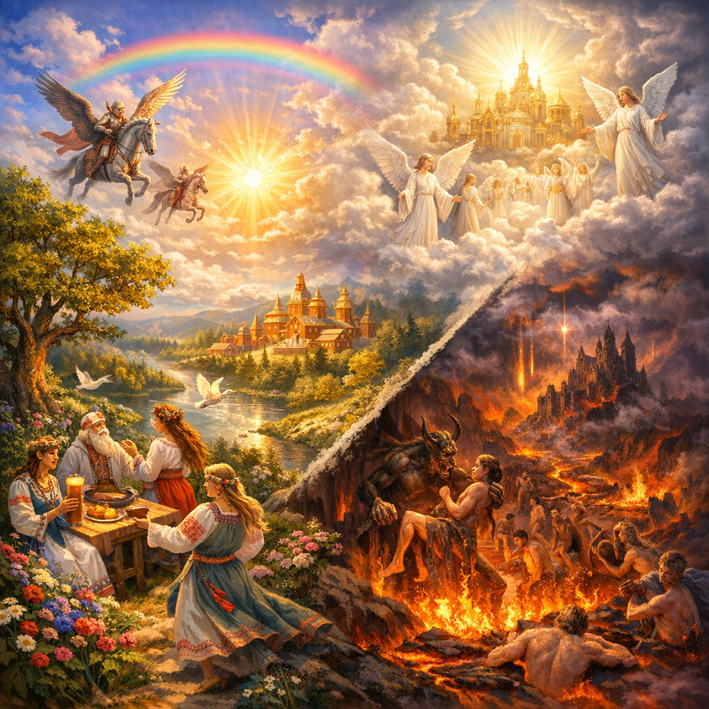 В русской традиции столкнулись два мощных сценария: славянская картина мира (Ирий, Навь, родовая память, круговорот) и христианская (рай, ад, Страшный суд, единая «линейка» спасения). И чем внимательнее вчитываешься в фольклор, обряды и церковные тексты, тем отчетливее видишь: спор идет не о небесах, а о человеке. Кто он — часть рода и земли или индивидуальная душа под судом?