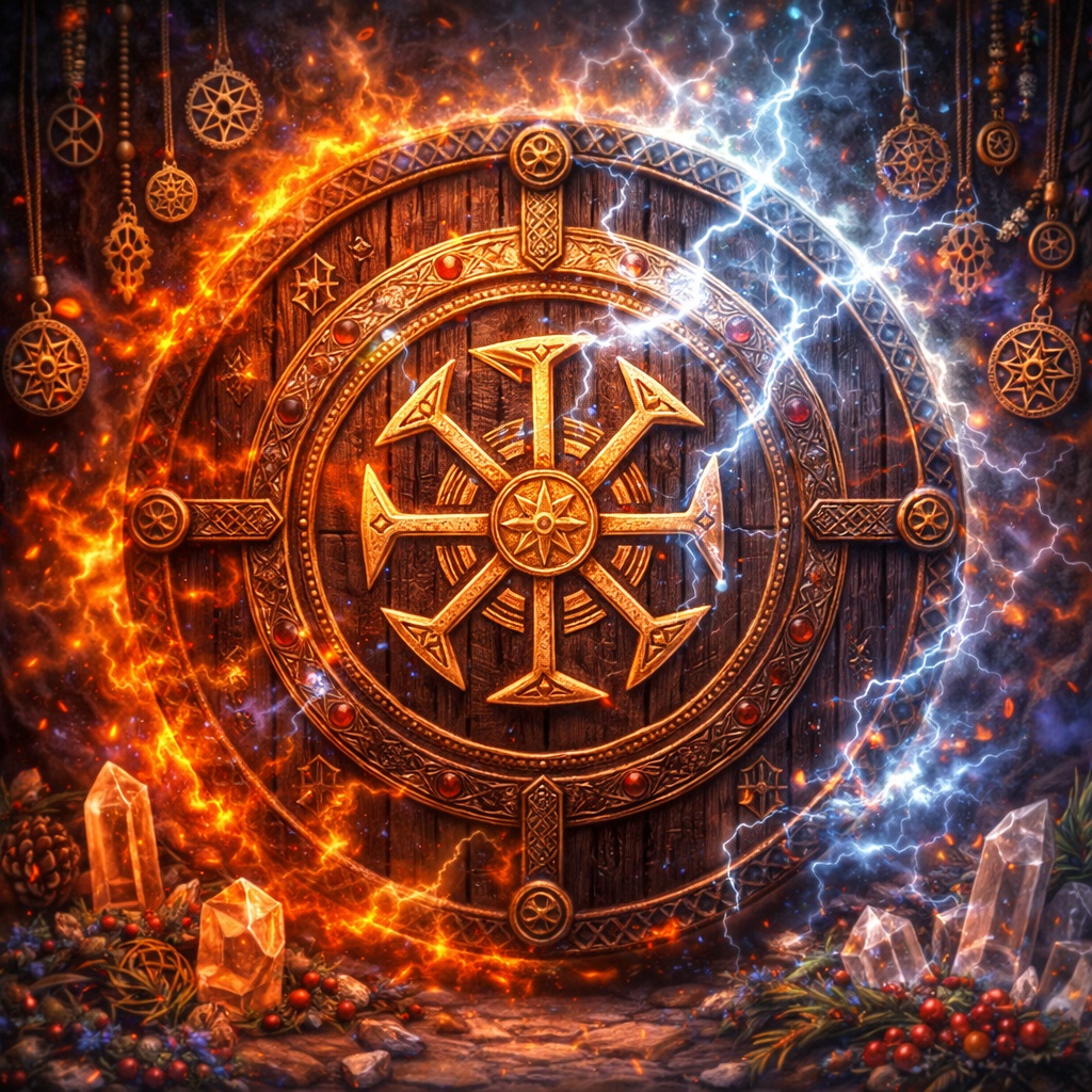 Языческий щит создаёт символическую границу. Он напоминает владельцу о стойкости, о родовой силе, о поддержке предков.
