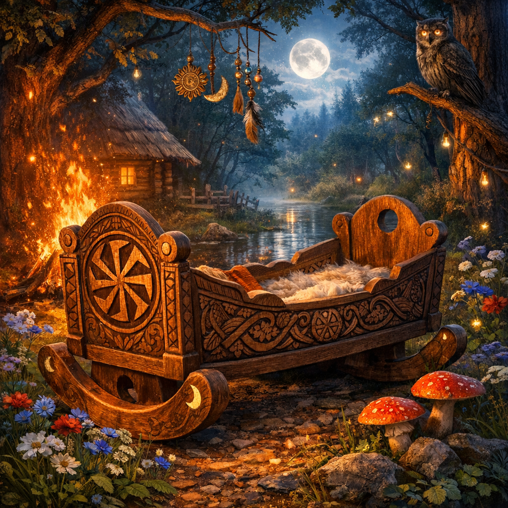 Колыбель — первый «трон» человека. И резьба на ней — это заявление семьи миру: чей это ребёнок и в каком он порядке растёт. Солярный круг — знак целостности и рода. Не в смысле плакатной идеологии, а в смысле: «мы — не случайные, у нас есть корни, мы стоим на земле».