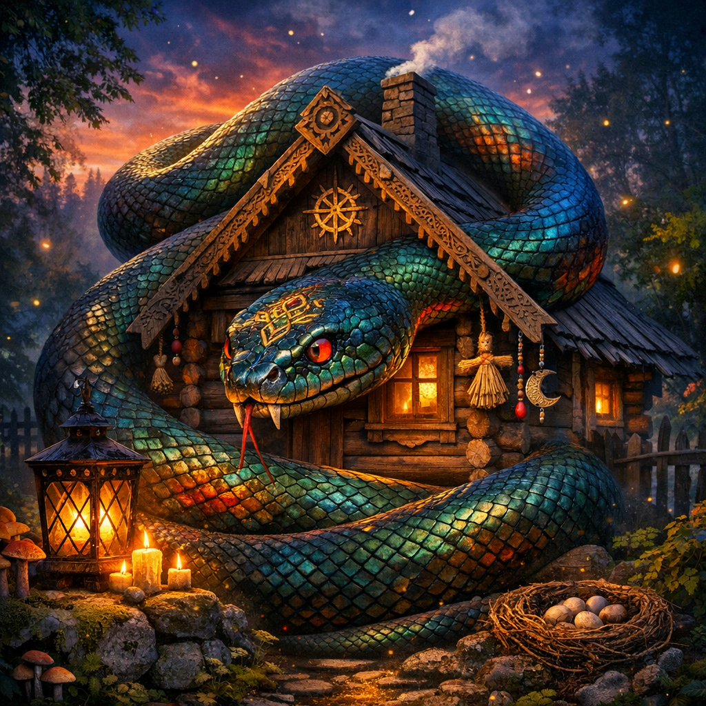 В народной традиции (и не только славянской) змей — не только «искуситель» из страшилок. Это архетип стража: он лежит на границе, охраняет вход, хранит клад, не пропускает лишних. Дом — это тоже клад. Ваши силы, сон, здоровье, отношения, деньги, планы, дети. Всё это ежедневно испытывается на прочность чужими взглядами, речами, визитами, даже случайными конфликтами в подъезде.